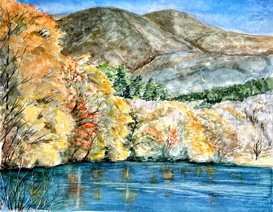 今日は趣味の水彩画セピアの会で月末の公民館祭りに展示する作品の指導先生のアドバイスを受けた。私の作品の修正部分は、山の色に青色を加えて薄くして遠景にする、紅葉をもっと増やす、湖面は一旦洗って映り込みと白の反射を増やすということだった。いずれの指摘も納得できる、これから修正が出来るのかやってみなければ分からない。