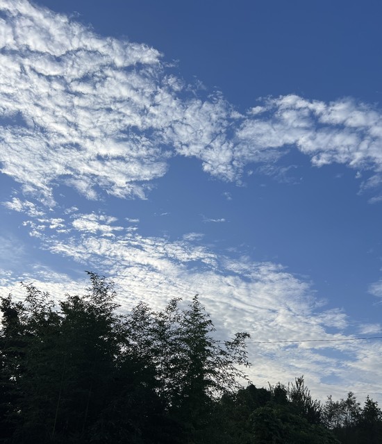秋の雲を眺める 日記 2025.10.18 朝の散歩の途中で秋の雲を眺めていると雲の流れが我が人生を回想させた。高浜虚子の歌に「秋雲は 老いの心に さも似たり」というのがあった。周りの人々に助けられて87歳まで生きてきたことに感謝しながら変化する雲を眺めた。 そこで出会った人は毎朝10kmぐらい歩いている83歳の知人だった。数年前から出会って挨拶だけで別れているが相変わらず元気のようで「頑張ろう!」が別れに交わす言葉になっている。 秋空(6;30)