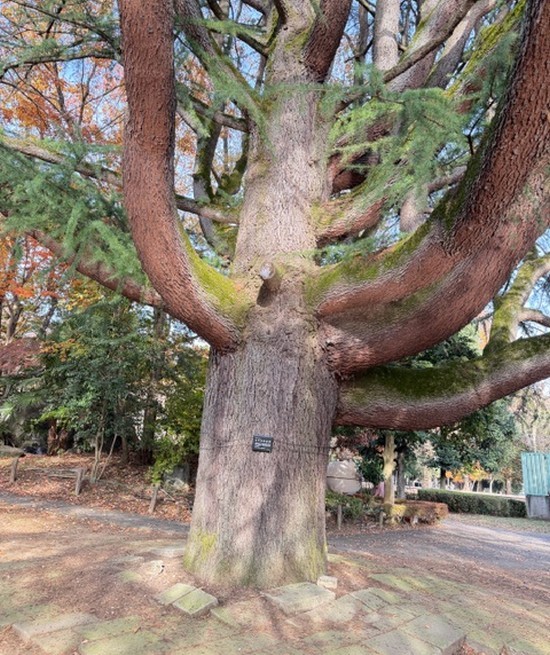 ヒマラヤスギに見惚れた 日記 2025.11.25 思い出した事だが、一昨日のコンサートの開演には時間があったので会館の隣にある明保野公園を散歩した。紅葉は少し過ぎたが大きなヒマラヤスギがあった。樹齢は不明だが「全国巨樹・巨林木の会」で巨樹として認定されているらしい。 太い幹周りから大きく湾曲して上へ伸びている姿が、なんとも不思議な光景を造り出しているが気迫ある生命力を感じた。