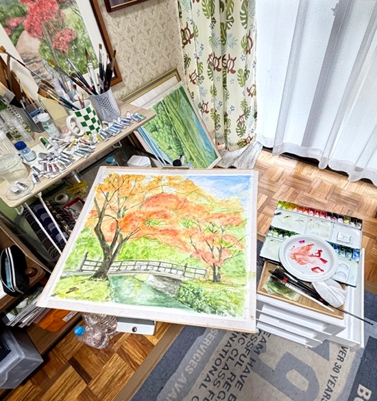 先月初旬に仲間と福島県の天鏡閣で開催された水彩画展を見学した帰りに猪苗代町にある紅葉で有名な「土津(はにつ)神社」に立ち寄った。この時のスケッチ画と写真を見ながらF10号に描いているが・・・今日は最終的に仕上げたいと思ったが途中で読みかけの本が気になり読書したりであっという間に時間が過ぎてしまった。