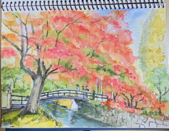 写真には橋を渡る人物も写っているので描いたが上手くいかない、橋の奥の背景など省略したりしたがこれも上手くまとまらない、彩色も思うような色がでない。一旦中断して最終的に仕上げたいがどうなるか、紅葉の魅力的な美しさをどーんと描いてみたいのだが・・・?。