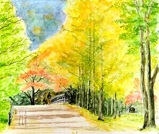 「秋の風景の記憶」とした題した水彩画を描いたがまだ完成とは思えない部分がある、仕上げる前に水彩画仲間の意見も聞いてからにしたくなった。一人の世界だけでは、思った考えが内側に閉じて曖昧になりやすい。
