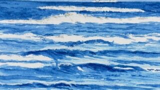 水彩画 海を描いてみた 海はスケッチしながら描いても動くので難しい、写真に撮ってみながら描いても上手く描けない。はっきりダメなのは水平線が水平になっていなかった、下手でも描いて見ないと進歩しない。結果がどうであろうと楽しく描いたからまぁいいか! 2025.11.24 水彩画